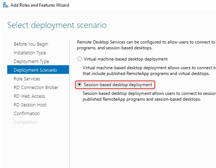 On the Deployment Scenario page, we will select Session-based desktop deployment, Next